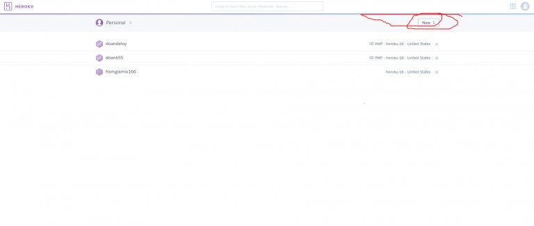 Sau khi chuẩn bị được những việc cần thiết nói trên, bạn đăng nhập vào tài khoản Heroku của mình. Ở trang Dashboard, bạn chọn New và Create new app ở góc trên bên phải để tạo repository trên Heroku: