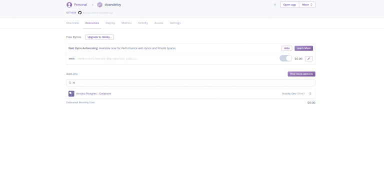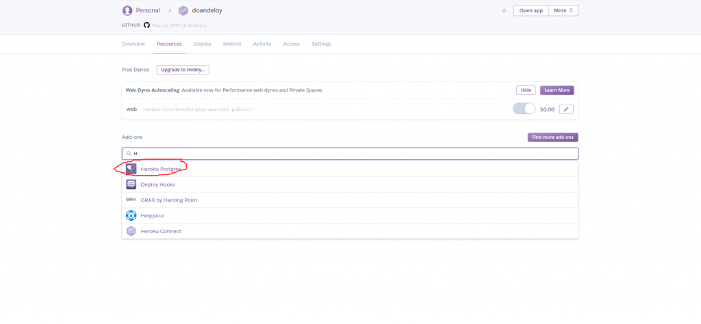 Quay lại với việc tạo CSDL, từ trang quản trị của app vừa tạo, ta chọn tab Resources và tìm kiếm add-ons có tên là Heroku Postgres.