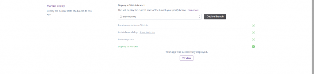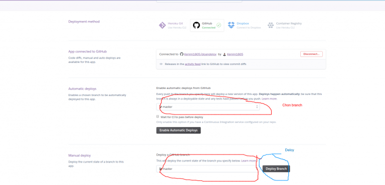 Nhấn vào vùng khoanh đỏ để kết nối Heroku với Git. Sau đó chọn nhánh mà mình đã push code lên để deploy. Ở đây do bạn chỉ có 1 nhánh đầu tiên lúc tạo ở phần 1. Sau đó nhấn deploy đợi kết quả thôi.