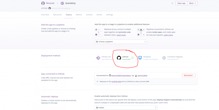 Giờ đến phần quan trọng nhất. Heroku có hỗ trợ việc kết nối giữa Heroku và Github. Giờ bạn đã hiểu sao phần trước mình bảo dùng Git rồi chứ. Việc của bạn bây giờ là kết nối heroku với git.