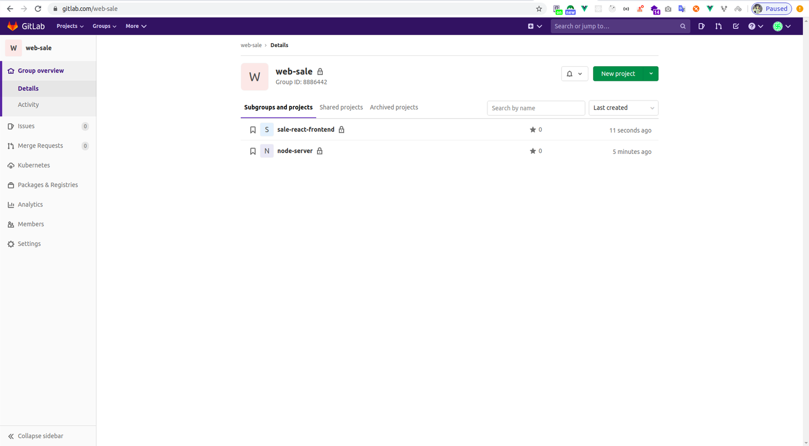 - Như bạn đã biết một trang web sẽ gồm rất nhiều thành phần: Api project, Frontend project, ... và vô vàn services đi kèm nữa. Với dự án của mình thì mình tạo 1 group có tên là web-sale và chứa một số project nhỏ trong đó.