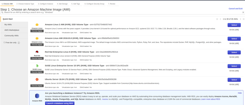 Bạn chú ý đến Free tier eligible là những OS bạn có thể cài đặt. Ở đây mình chọn AWS Linux AMI 2018 đã được cài sẵn Ruby