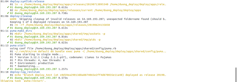 Chú ý: Hạn chế việc cài puma bằng tay trên server vì có thể dẫn đến puma khai báo trong rails và trên server không đồng nhất. Khi đó sẽ phát sinh hiện tượng khi