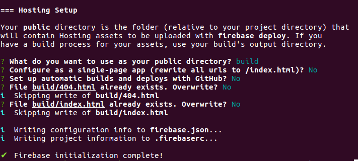 - File build/404.html already exists. Overwrite? Nó hỏi mình có ghi đè file build/404.html không thôi, chả có gì cả.