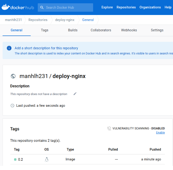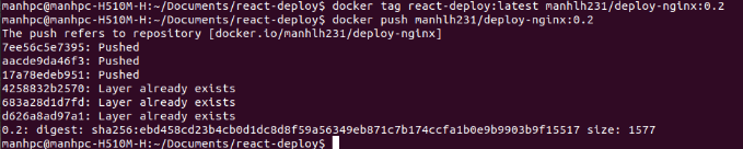 Với câu lệnh trên, chúng ta vừa push image react-deploy với tag latest ở local lên repository manhlh231/deploy-nginx với tag 0.2 trên Docker hub.