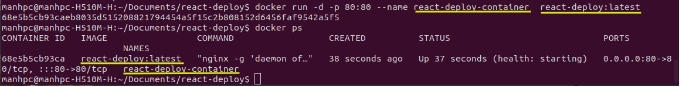 Với câu lệnh trên thì chúng ta sẽ run 1 container từ image “react-deploy:latest” với các option: