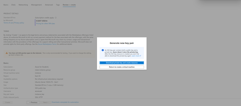 Review + create, và cuối cùng chọnCreatenha. Khi này sẽ có một cửa sổ hiện lên để chúng ta downloadprivate keynhằm cho việc truy cập đếnVPSnày nha.![]()