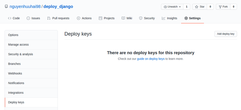 Lệnh trên sẽ in ra toàn bộ public key ra cửa sổ terminal, bạn chỉ cần copy nó lại. Tiếp theo truy cập vào repo trên GitHub và chọn mục Settings. Ở cột bên trái của tab Settings, chọn Deploy keys. Trong mục này, tiếp tục chọn Add deploy key và nhập lần lượt tên mà bạn muốn đặt cho key này và public key vừa copy ở bên server bỏ vào đây và chọn Add key để hoàn tất quá trình này