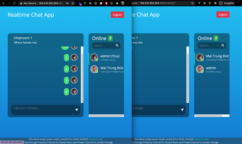 Các bạn thử tạo 2 account và có thể thấy rằng đến đây ta đã có thể chat realtime ngon nghẻ rồi nha: