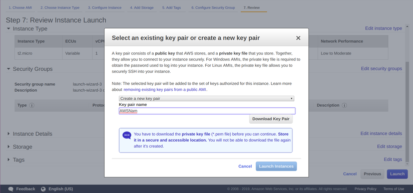 Ở đây thì nó cũng đã bảo chúng ta là tạo khóa. Aws sẽ lưu trữ 1 khóa và chúng ta sẽ lưu 1 khóa. Muốn Ssh lên instance thì bạn cần có cái khóa này. Và không nên chia sẽ cái khóa này nếu bạn không muốn người khác có thể truy cập vào Instance. OK nhấn download key và launch instance => View instance.