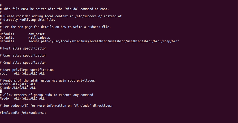 Mở file sudoers và add thêm dòng %namdv ALL=(ALL) ALL như sau: