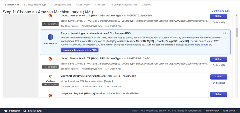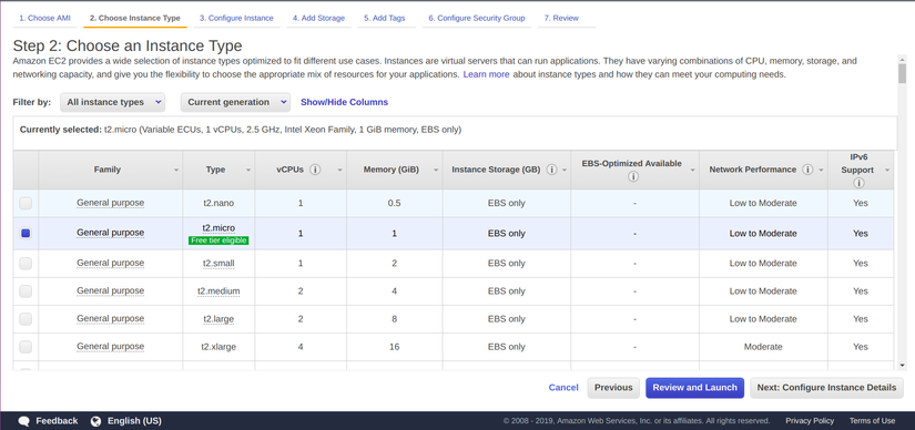 Để tạo instance thì click vào Launch instance. Sau khi vào thì chúng ta sẽ được chọn Hệ điều hành ... của instance. Chú ý chỉ chọn những instance có note là Free tier eligible để được sử dụng free. Mình làm việc với ubuntu 16.04 nên sẽ chọn Ubuntu Server 16.04 LTS (HVM), SSD Volume Type. ![]()