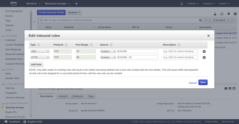 ![]() Ấn chuột phải vào. Và chọn edit inbound rule. Ấn chuột phải vào. Và chọn edit inbound rule.![]() Add rule mới. type là http, port 80 => save. Add rule mới. type là http, port 80 => save.![]()