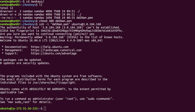 - Giờ chúng ta ssh vào user namdv bằng lệnh ssh namdv@3.0.184.168.