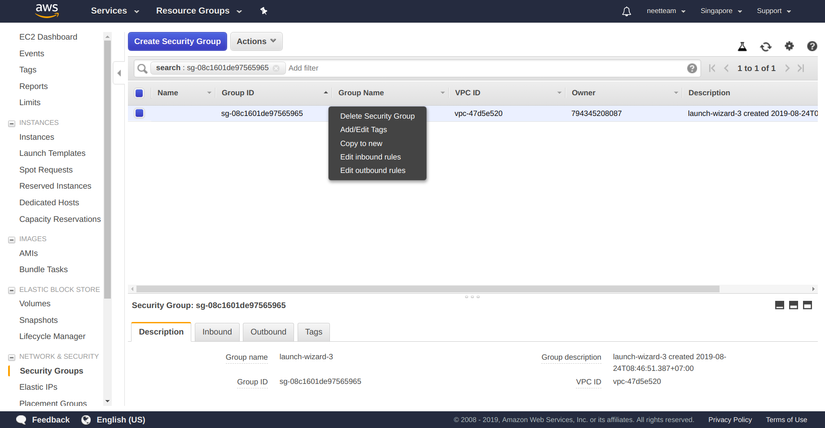 Ở mục instance. Mình kéo sang ngang tìm cột Security Group. => Ấn vào launch wizard 3