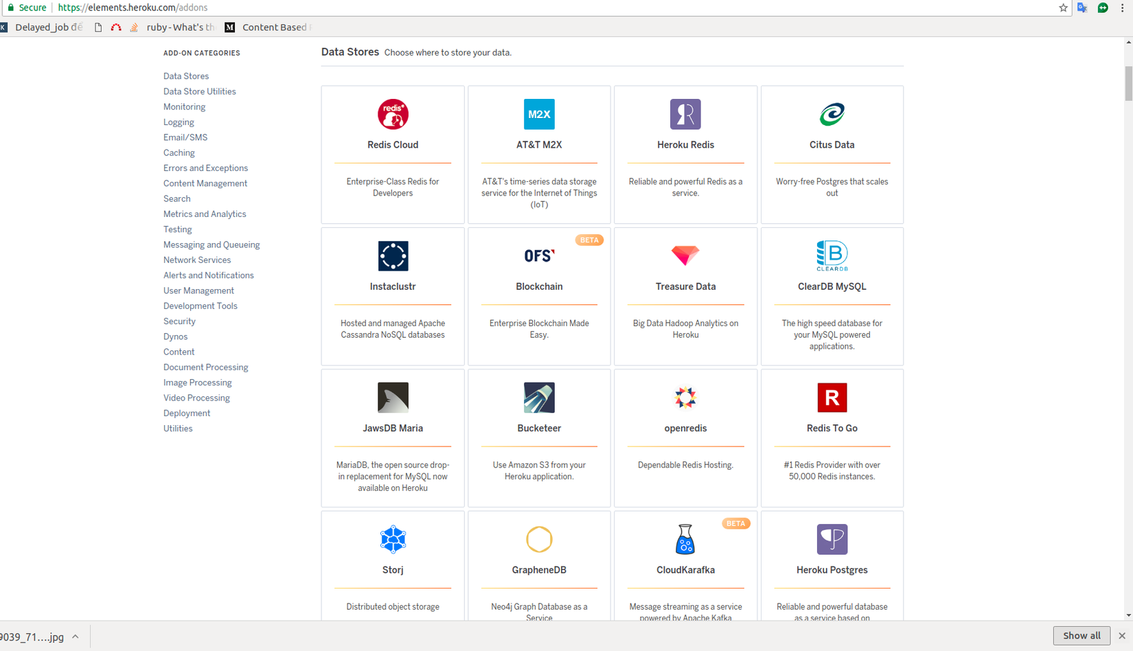 Do Heroku không hỗ trợ mysql như một lựa chọn mặc định, do đó chúng ta phải config và lựa chọn Data stores tại https://elements.heroku.com/addons