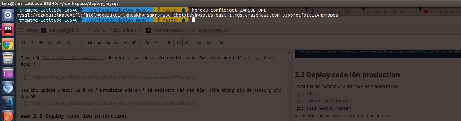 Các ứng dụng Ruby on Rails có thể sử dụng cơ sở dữ liệu được cấp phép bằng cách đặt lại biến môi trường DATABASE_URL của chúng với giá trị được giữ bởi JAWSDB_URL. Từ đó heroku có thể tự động tạo ra một file database.yml tương ứng giống như ở development. Những thao tác này ta có thể thao tác thông qua GUI ở phần Setting của app tương ứng trong https://dashboard.heroku.com/apps Tuy nhiên ở đây mình sẽ setup bằng dòng lệnh (và theo mình thì nó khá đơn giản so với GUI):