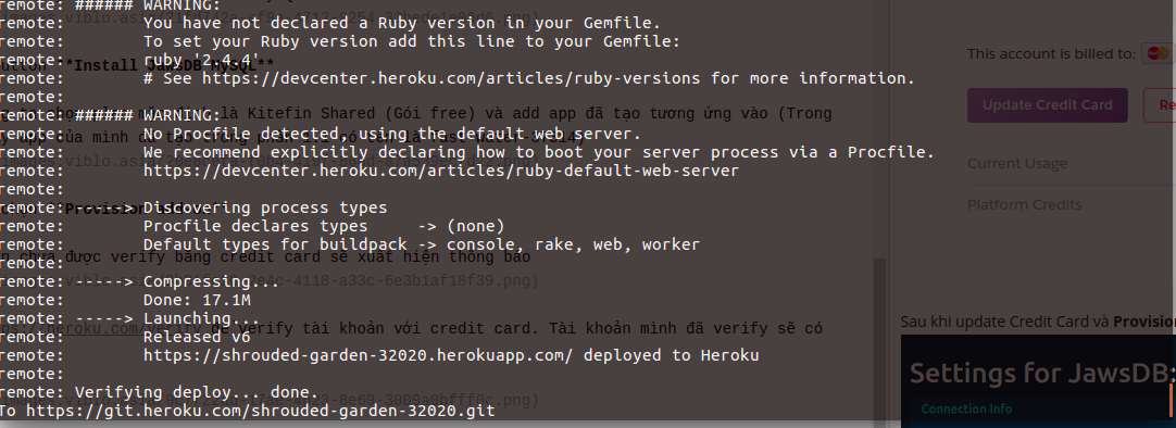 Sau khi update Credit Card và Provision add-on sẽ redirect đến màn hình chứa thông tin để setting cho JawsDB