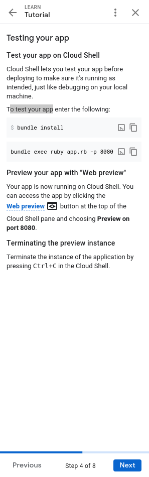 Trước khi deploy thì chúng ta cần kiểm tra trước những cài đặt và đảm bảo được con app của chúng ta đang chạy ngon lành với file app.rb. Nên sau khi chạy 2 lệnh trên thành công thì bạn đã có thể preview Web app bằng cách click vào Web previrew