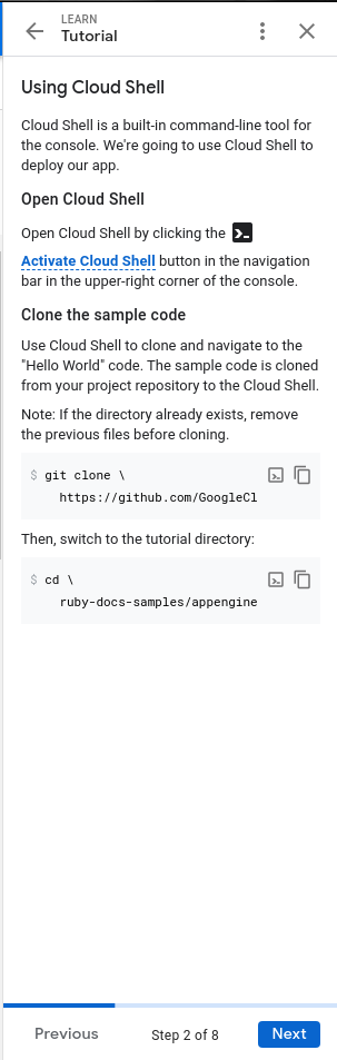 App Engine Quickstartđể tiến hành deploy một ứng dụng demo Ruby được public trên repo git của google lên server. Sau đấy bạn chọn ngôn ngữ để get app Hello World. Dĩ nhiên chúng ta sẽ chọn Ruby cho mục này. -