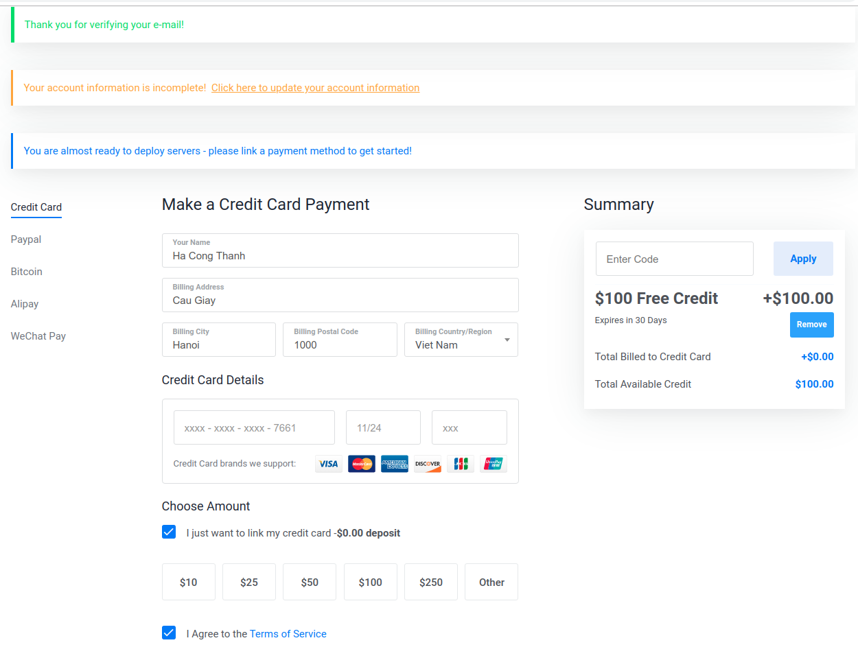 Các bạn có thể vào thẳng link này để đăng ký gói ưu đãi 100$. Hoặc bạn có thể vào link này để xem thêm nhiều gói ưu đãi khác của Vultr nhé.