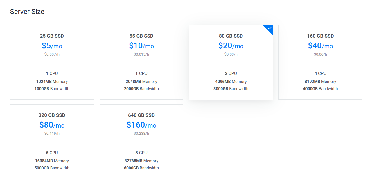 Ở đây mình chọn gói 20$ / 1 tháng, có 2 CPU, 4Gb RAM và 3000Gb băng thông