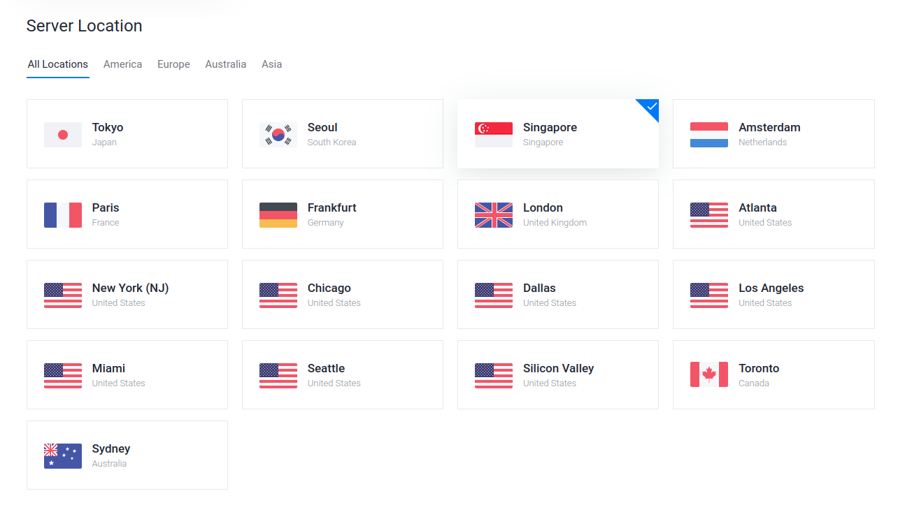 Hiện nay Vultr đang có đến 17 nơi đặt máy chủ trải rộng trên toàn cầu. Ta sẽ ưu tiên chọn Location gần Việt Nam như Nhật Bản, Hàn Quốc, Singapore để tốc độ truyền tải về Việt Nam là nhanh nhất. Bên cạnh đó cũng có những Location ổn định như của Mỹ (Seattle, New York, ...)