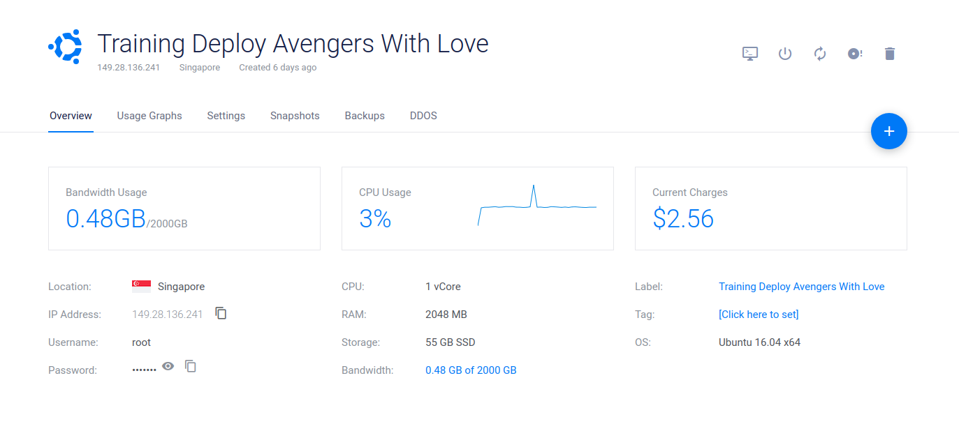 Từ đây, bạn có thể nhìn thấy được địa chỉ IP và thông tin tài khoản root để ssh lên server lần đầu. Tuy nhiên khi ssh lên nhớ đổi pass luôn của tài khoản root đi nhé.