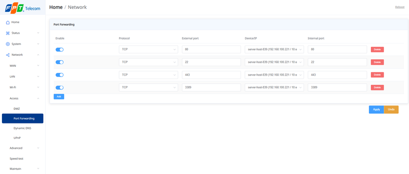 - On my router, it’s located under Network → Access → Port Forwarding.