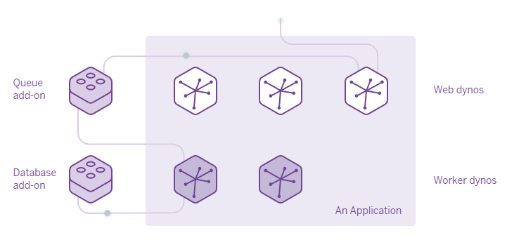 Khi bạn triển khai một ứng dụng Heroku, bạn phải thiết lập một máy ảo được gọi là slug, sử dụng 1 hay nhiều buildpacks. Khi một máy ảo được khởi chạy từ slug đó, nó được gọi là dyno. Về cơ bản, thì chúng ta hiểu nôm na là khi triển khai thì mặc định heroku sẽ tạo ra một container chứa đầy đủ các môi trường liên quan cho ứng dụng của bạn hoạt động.