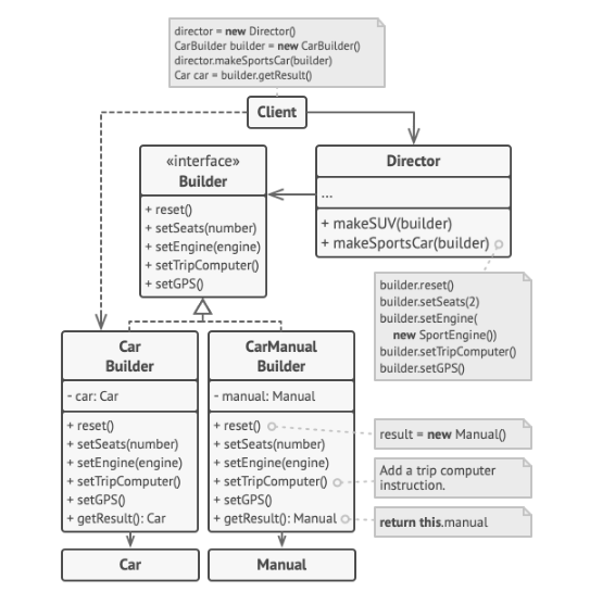 Ví dụ về mẫu Builder này minh họa cách bạn có thể sử dụng lại cùng một mã xây dựng đối tượng khi xây dựng các loại sản phẩm khác nhau, chẳng hạn như ô tô và tạo hướng dẫn sử dụng tương ứng cho chúng.