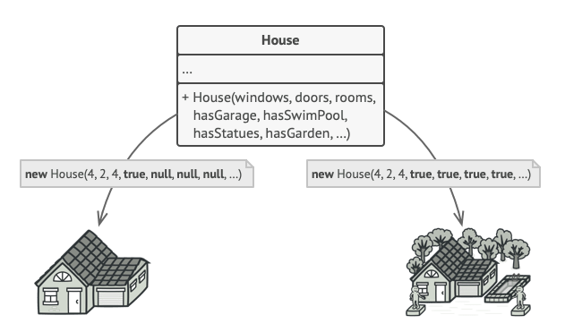 Có một cách tiếp cận khác không liên quan đến việc lai tạo các lớp con. Bạn có thể tạo một hàm tạo khổng lồ ngay trong lớp House cơ sở với tất cả các tham số có thể có để điều khiển đối tượng House. Trong khi cách tiếp cận này thực sự loại bỏ sự cần thiết của các lớp con, nó tạo ra một vấn đề khác.