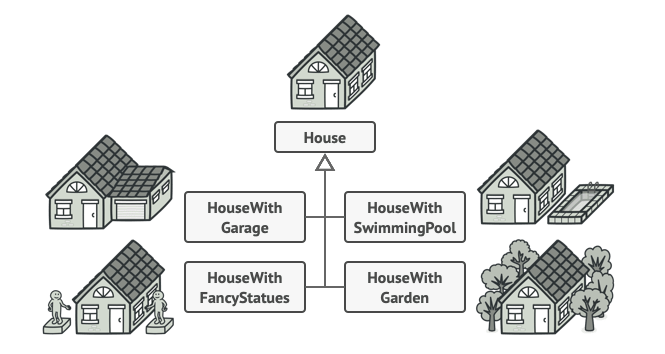 Giải pháp đơn giản nhất là mở rộng lớp House cơ sở và tạo một tập hợp các lớp con để bao gồm tất cả các kết hợp của các tham số. Nhưng cuối cùng bạn sẽ kết thúc với một số lượng đáng kể các lớp con. Bất kỳ thông số mới nào, chẳng hạn như kiểu hiên nhà, sẽ yêu cầu phát triển hệ thống phân cấp này nhiều hơn nữa.
