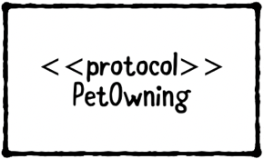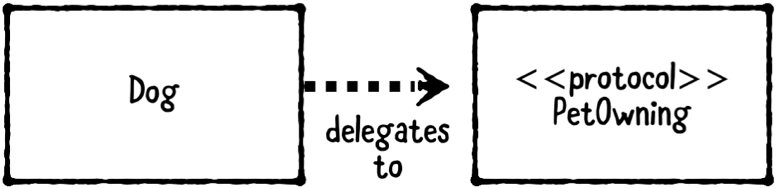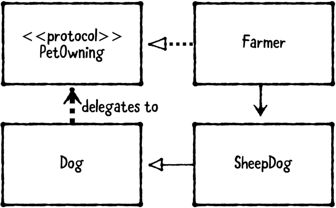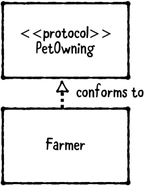 Chúng ta có thể đọc quan hệ này là "implement" hoặc "conform to". Ví dụ, chúng ta biểu diễn class Farmer implements PetOwning protocol như sau: