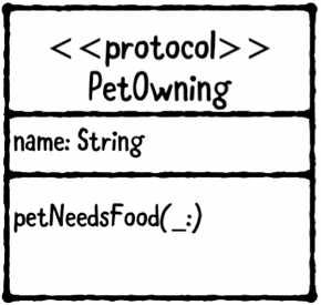 Có thể biểu thị các thuộc tính và phương thức trong Class Diagram. Ví dụ, chúng ta có thể biểu diễn class PetOwning có thuộc tính name và phương thức petNeedsFood(_:) như sau: