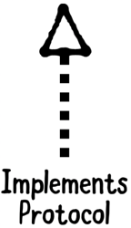 Để biểu diễn một class được implement một protocol, ta sử dụng mũi tên đứt đoạn với đầu mũi tên là một hình tam giác rỗng: