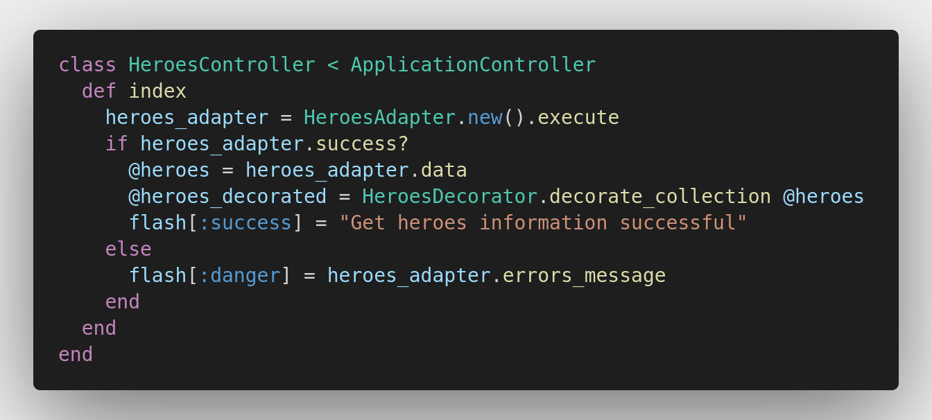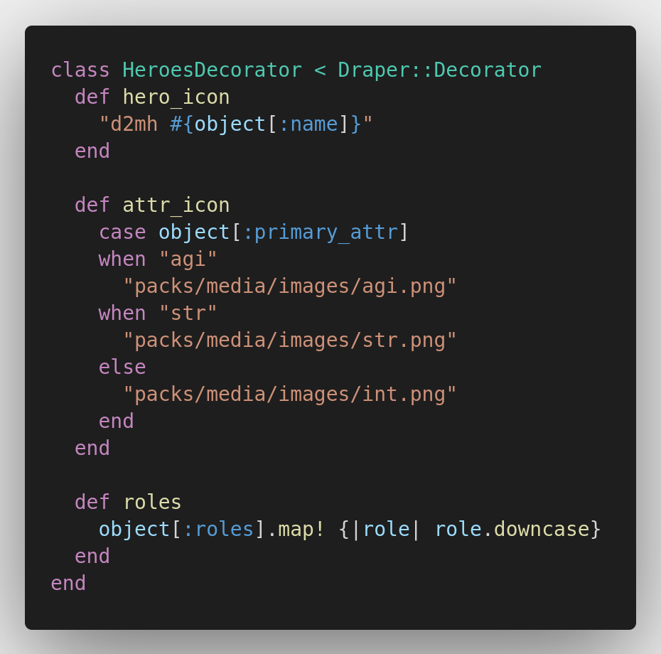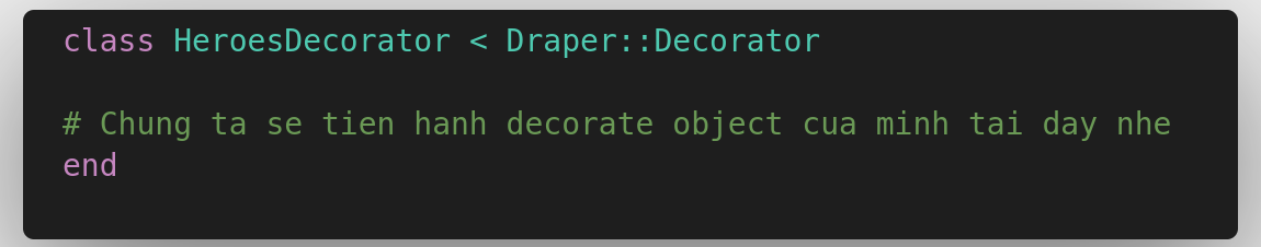 Ở ví dụ lần này mình không thực hiện thao tác với Db mà chỉ lấy data từ API về hiển thị thôi nên mình sẽ không tạo decorator theo 2 cách trên mà sẽ tạo ở file heroes_decorator.rb ở đường dẫn apps/decorators/ (nếu chưa có thì các bạn phải tạo nhé). Các decorators được viết đều sẽ được kế thừa từ Draper::Decorator.