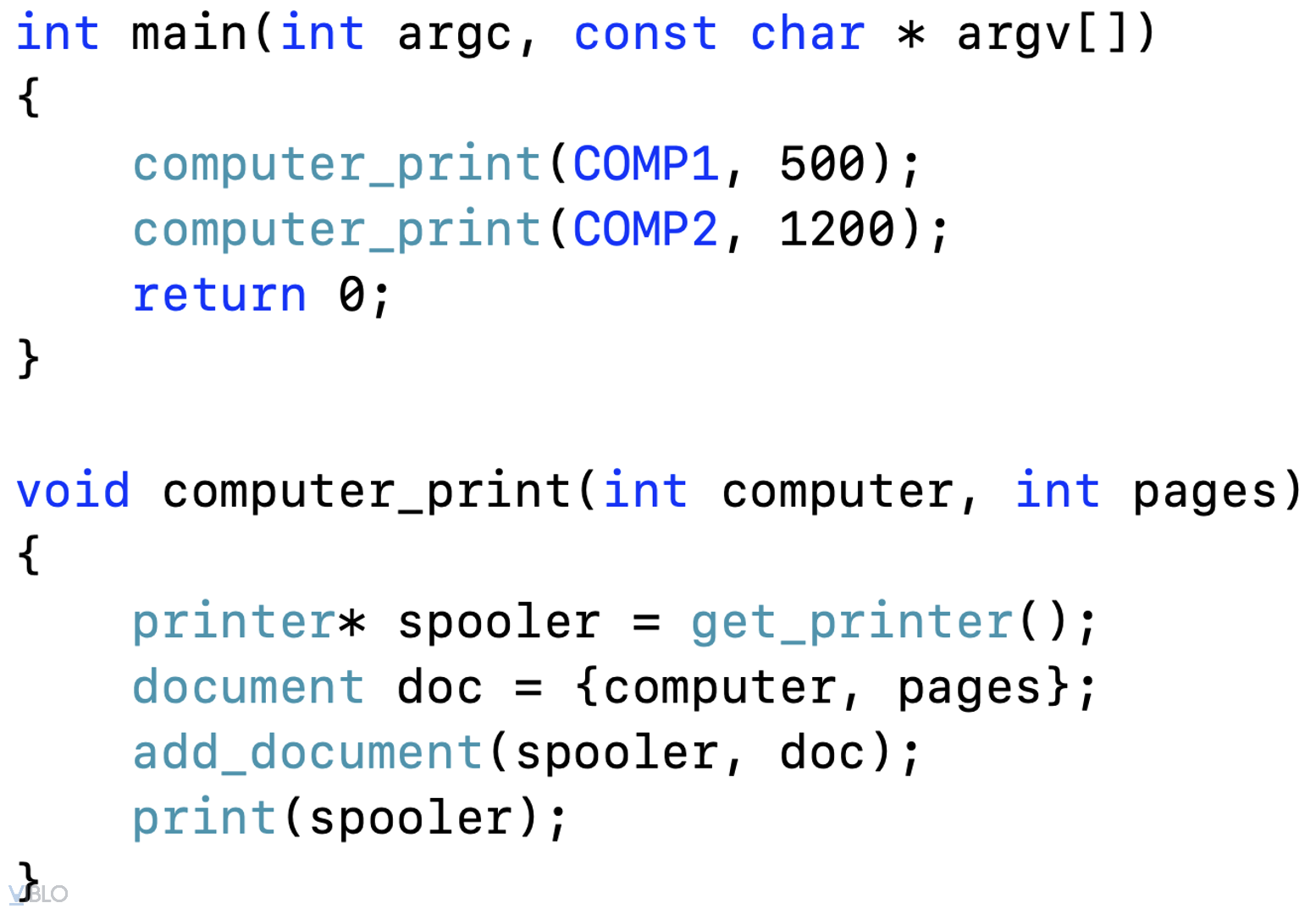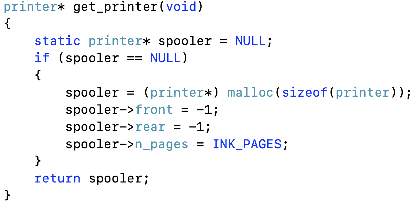 Biến spooler được khai báo là static, ban đầu được khởi tạo là NULL. Nếu hàm get_print được gọi lần đầu tiên, đoạn code trong câu lệnh if sẽ chạy và spooler sẽ được trỏ đến 1 cấu trúc trong Heap do câu lệnh malloc. Từ sau này, các lời gọi đến hàm get_printer sẽ chỉ đơn giản nhận lại con trỏ spooler đã trỏ đến vùng nhớ được khởi tạo trước đó (của lần gọi đầu tiên). Ví dụ về việc sử dụng hàm get_printer để in (giả lập) một tài liệu: