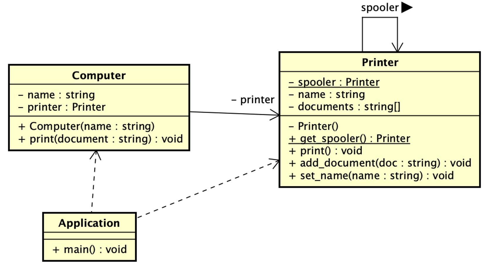 Một ví dụ rất hay được sử dụng để minh họa Singleton (cũng có trong Kinh thánh về DP của Nhóm bộ tứ) là ví dụ về máy in (Printer) và trình điều khiển máy in (Spooler). Giả sử trong 1 văn phòng, có nhiều máy tính (Computer) kết nối đến 1 máy in. Mỗi máy tính có 1 trình điều khiển máy in và ra lệnh cho máy in thông qua trình điều khiển này. Nếu các trình điều khiển máy in này hoạt động riêng rẽ thì có khả năng 2 máy tính ra lệnh in cùng lúc sẽ làm các tài liệu in bị chồng chéo. Từ đó dẫn đến nhu cầu trình điều khiển máy in phải là duy nhất và được chia sẻ giữa các máy tính => BÙM Singleton hiện ra để giải quyết!