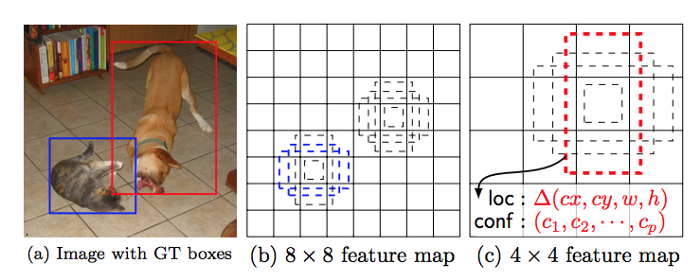 Dưới đây là ví dụ cho việc sử dụng feature map nhiều tỷ lệ và bbx default để có thể detect ra các object nhiều kích thước: