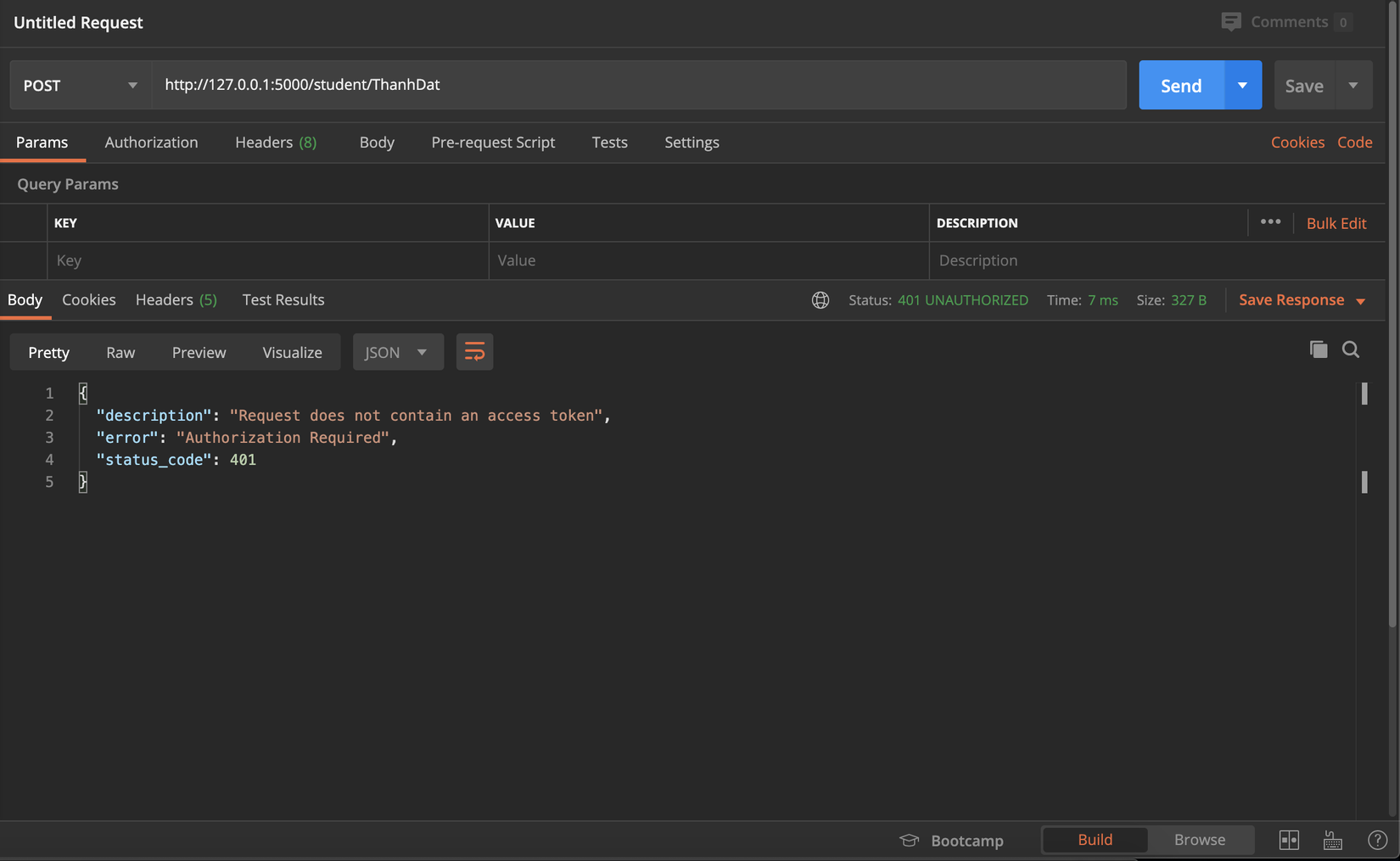 Nếu không có access_token thì kết quả trả về sẽ lỗi ngay, sửa lại Url một chút chúng ta sẽ được như sau, thêm body có School_id là 1 nữa chúng ta sẽ tạo được Student