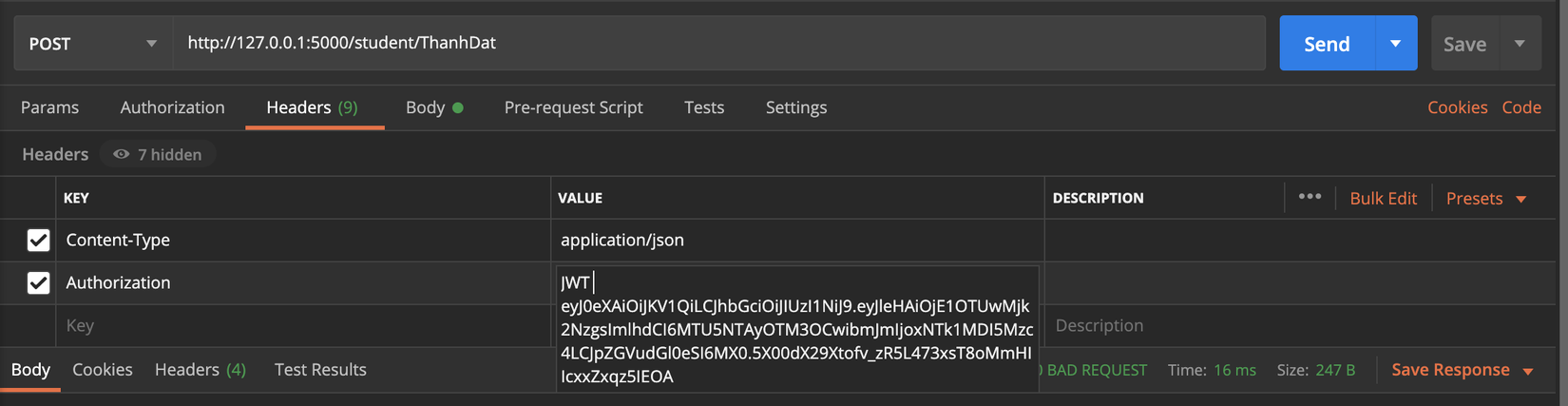 Chúng ta có @jwt_required() để giúp Flask hiểu chúng ta cần JWT access_token để chạy phương thức này, nếu sai token thì phương thức sẽ trả về error