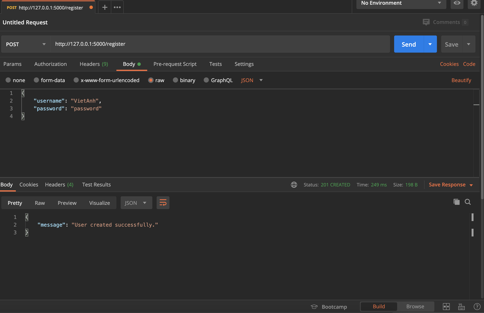 Còn nếu không có thì chúng ta sẽ tạo một UserModel từ data, sau đó lưu vào database, trả về một json có message với status code là 201, có nghĩa là "Created"