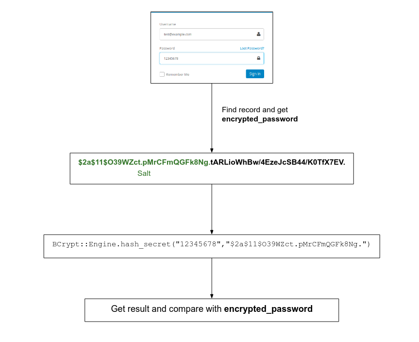 Rất đơn giản, sau khi user submit thông tin đăng nhập (giả sử gồm email và password), hệ thống sẽ tìm kiếm record tương ứng với email đã gửi lên, lấy được encrypted_password, sau đó việc xác thực sẽ diễn ra như sau: