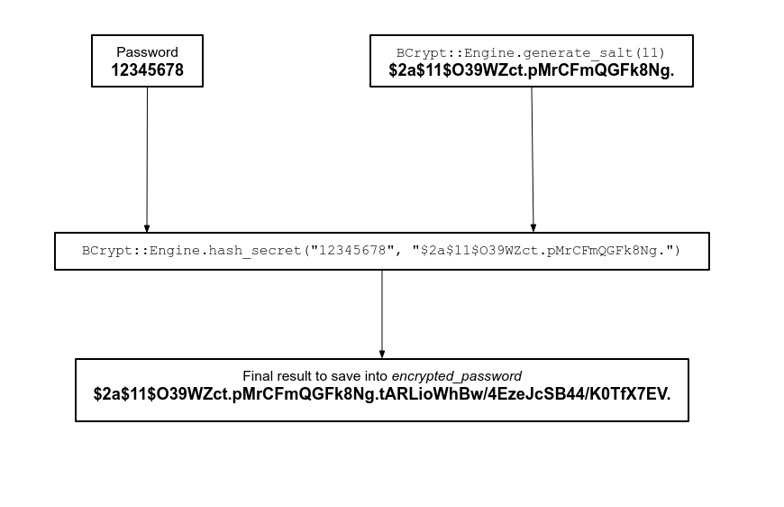 Khi user thiết lập password, một chuỗi salt ngẫu nhiên sẽ được sinh ra bởi hàm BCrypt::Engine.generate_salt(cost). Sau khi có được salt ($2a$11$O39WZct.pMrCFmQGFk8Ng.), Devise tiếp tục gọi tới hàm BCrypt::Engine.hash_secret(password, salt) để có giá trị hash value cuối cùng ($2a$11$O39WZct.pMrCFmQGFk8Ng.tARLioWhBw/4EzeJcSB44/K0TfX7EV.) và lưu xuống database ở trường encrypted_password.