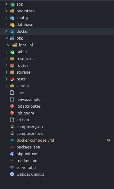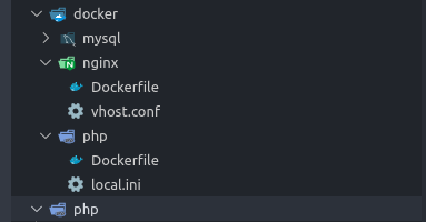 Thư mục docker, trong thư mục này có các thư mục con như php, nginx, mysql, trong các thư mục con này chứa những file Dockerfile và conf để build môi trường (nginx)