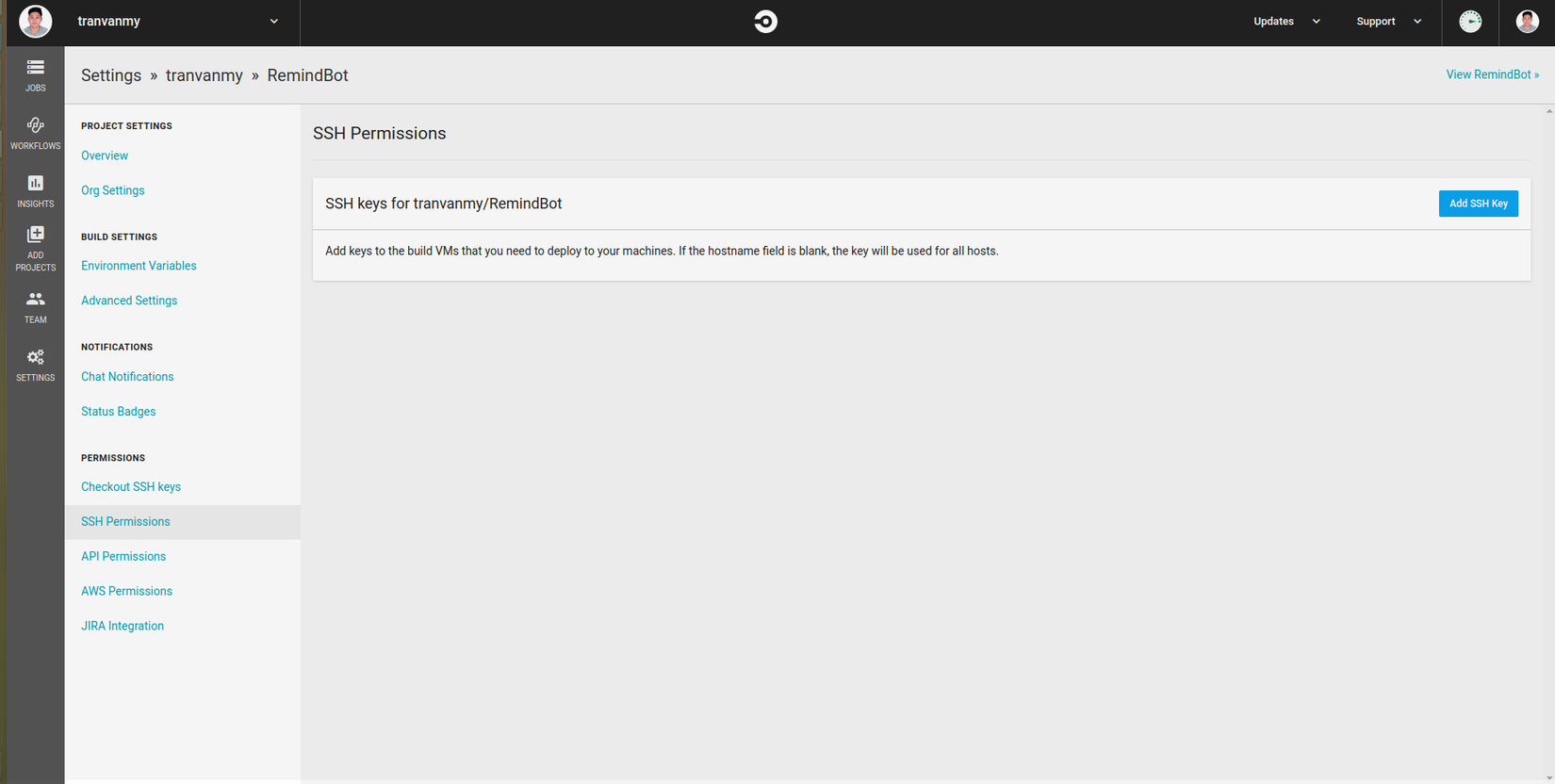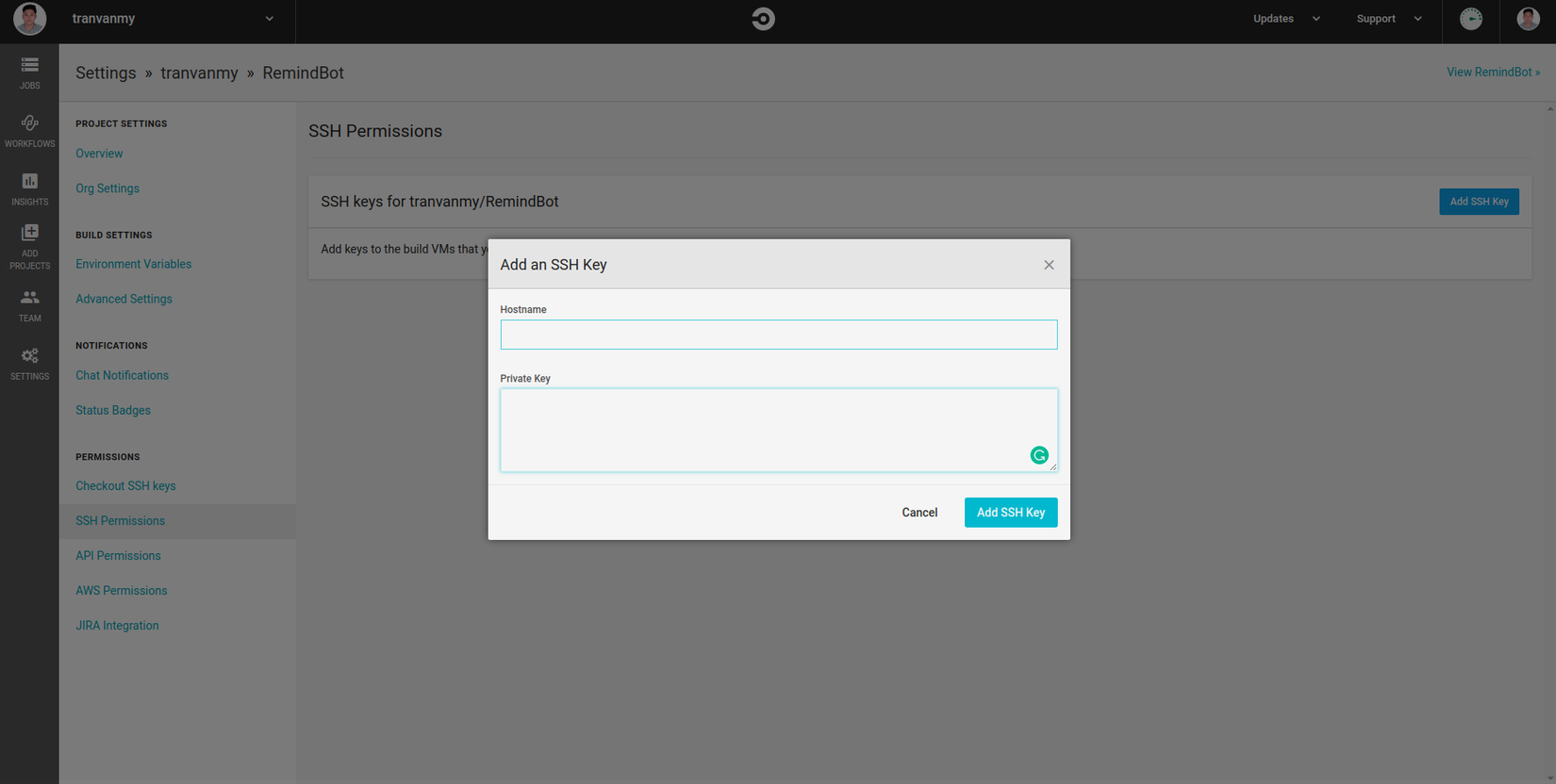 Mọi người copy cái private key ở thư mục ~/.ssh/id_rsa ở máy local của mọi người và paste cái này cùng với hostname của server vào SSH Permission trong phần setting của project trên CircleCI nhé.