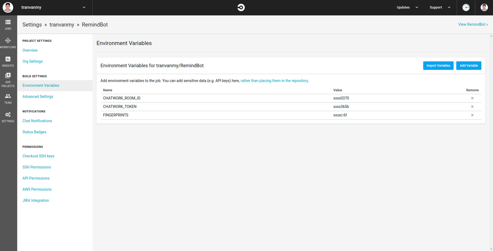 Có 1 vài biến như $CHATWORK_TOKEN , $CHATWORK_ROOM_ID để tránh bị lộ thông tin thì mọi người config trong phần Enviroment Variables là được nhé.