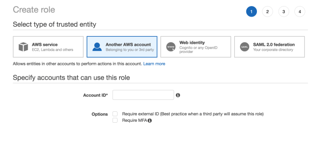 - Tiếp đến chúng ta hãy chọn Another AWS account và Account ID của tài khoản B