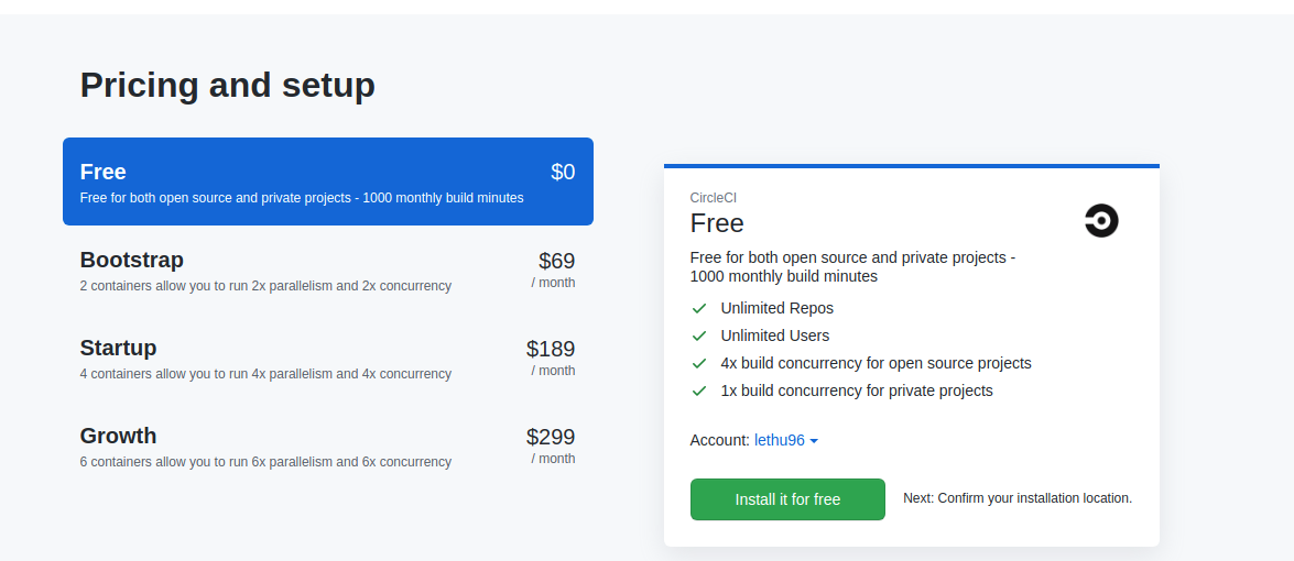 CircleCI cung cấp cho người dùng 4 gói, ở đây mình sẽ đăng kí gói free (vì mình hổng có xiên) các bạn có thể thấy ở gói free chúng ta có :